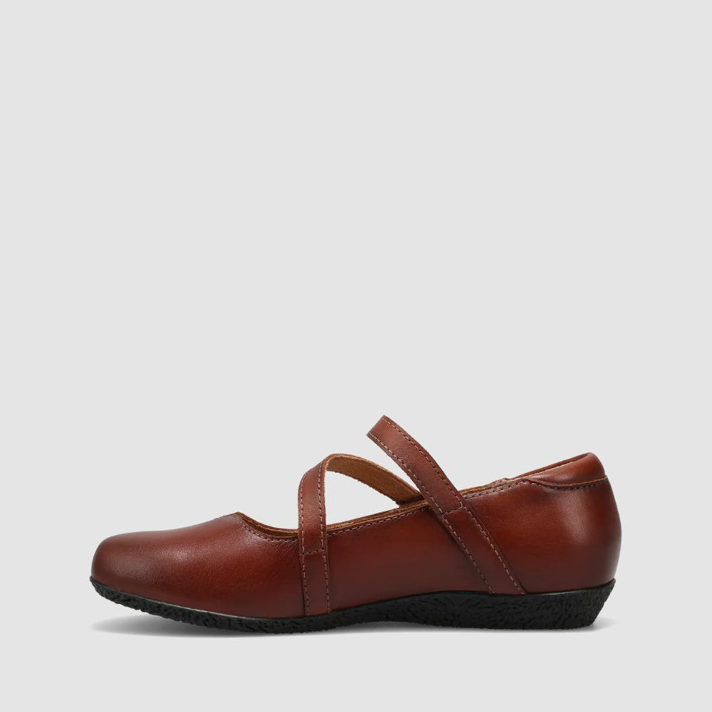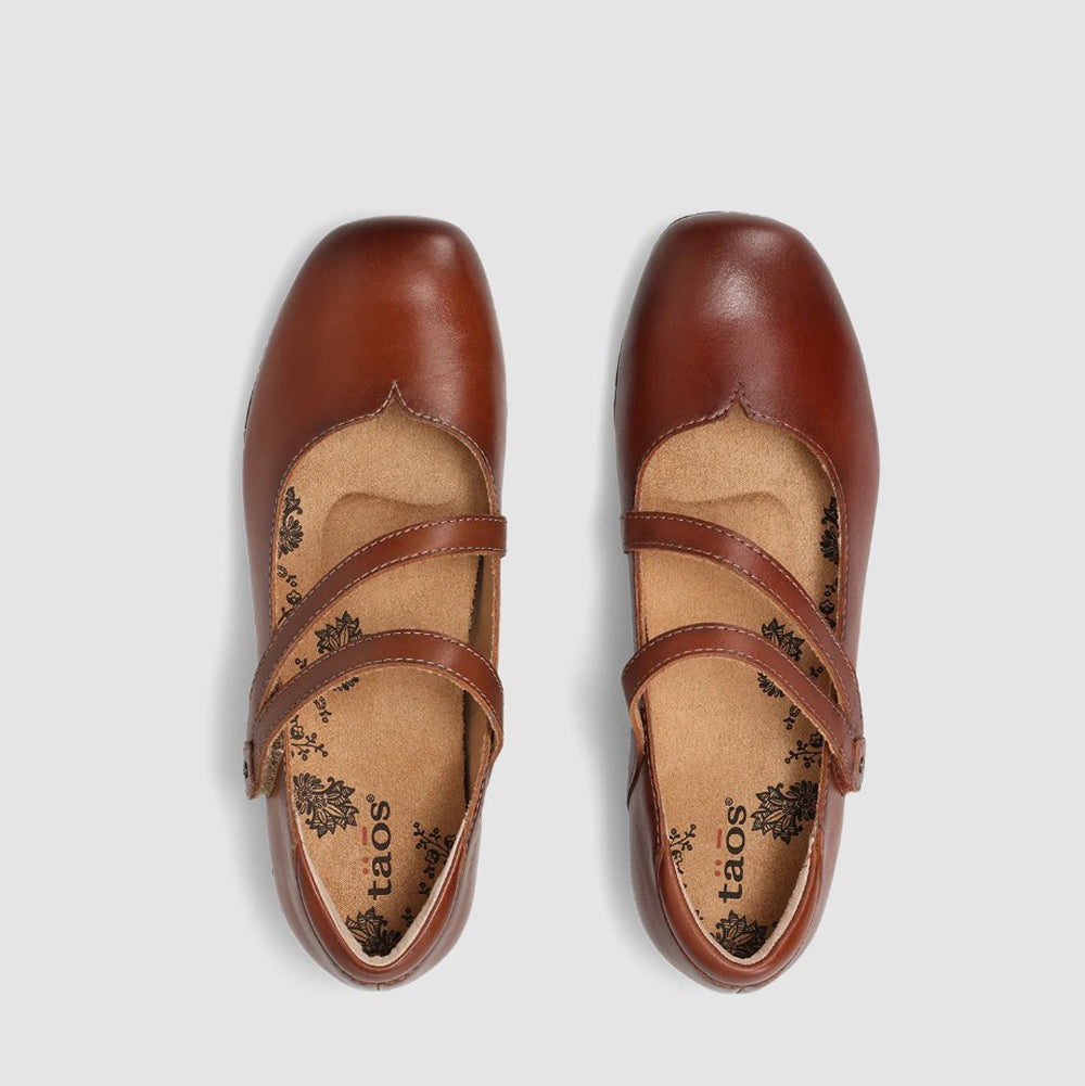 Simple yet timeless, this cognac leather Mary Jane flat features dual crossover straps, a soft cushioned footbed, and a flexible rubber sole. Delivering all-day comfort with effortless everyday style.