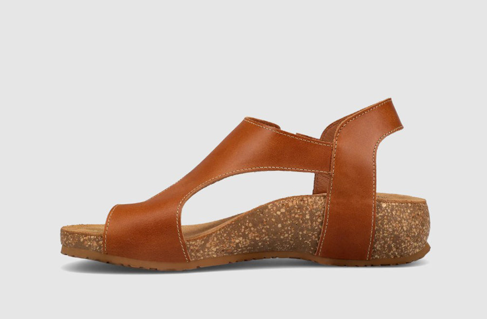 The Fame in tan by Taos is the perfect casual or dressy sandal. This sandal features a leather upper, cork midsole, a back strap, and an adjustable hook and loop ankle closure for a more secure fit.