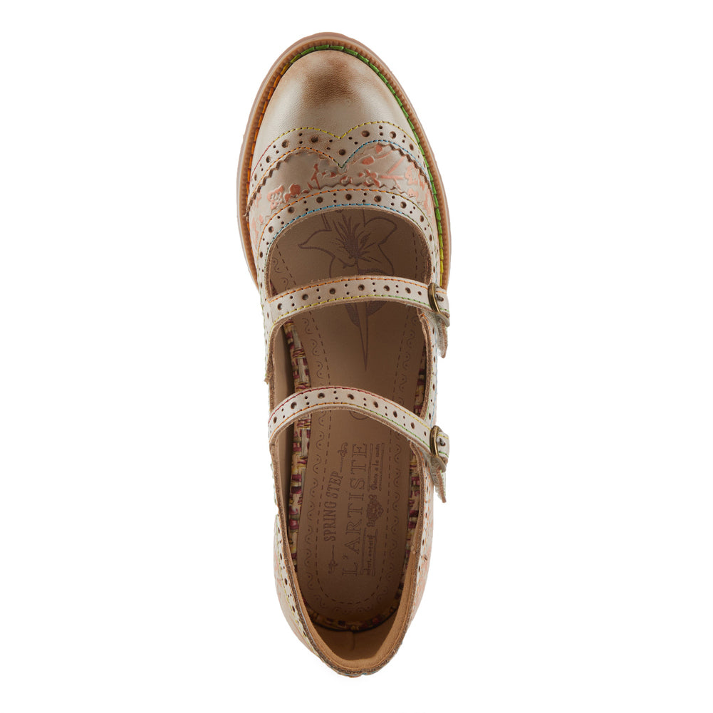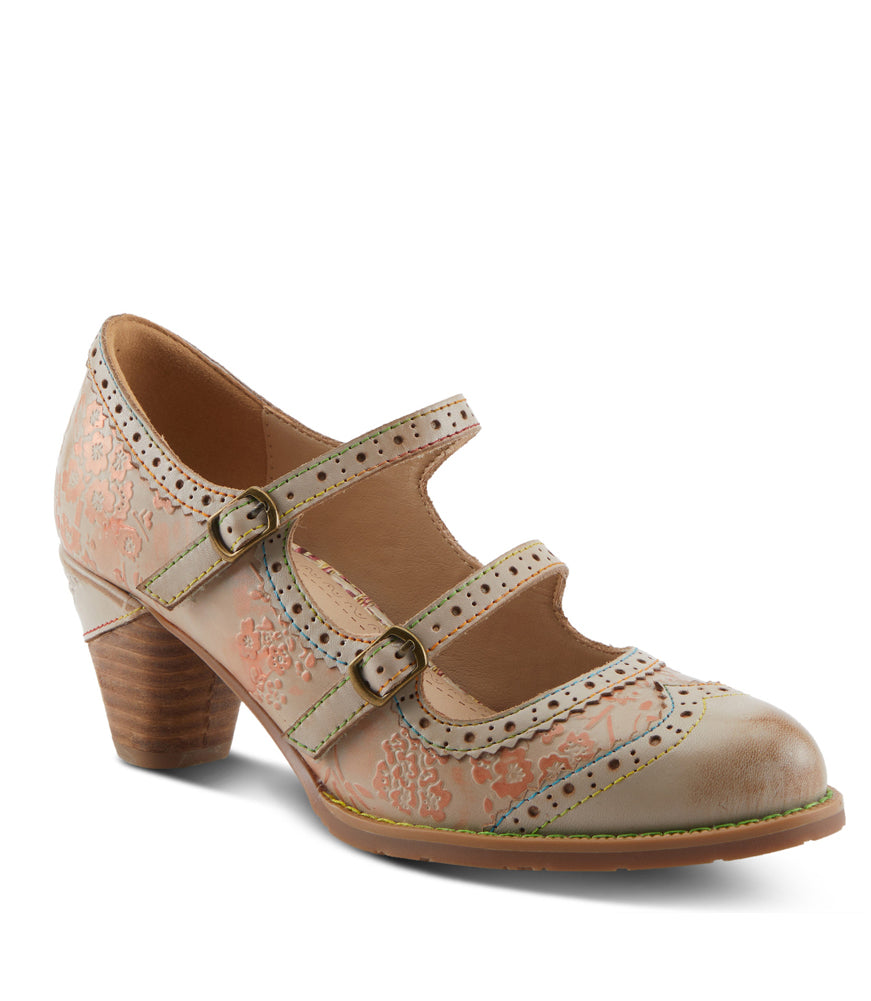 Vintage charm meets modern comfort in this blush-toned Mary Jane, featuring embossed floral leather, dual buckle straps, and a stacked mid-heel that offers timeless style for both casual and dressy occasions.