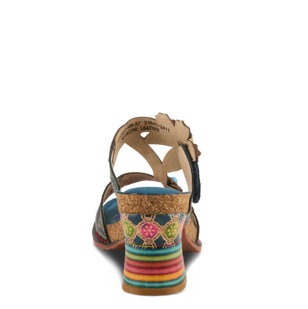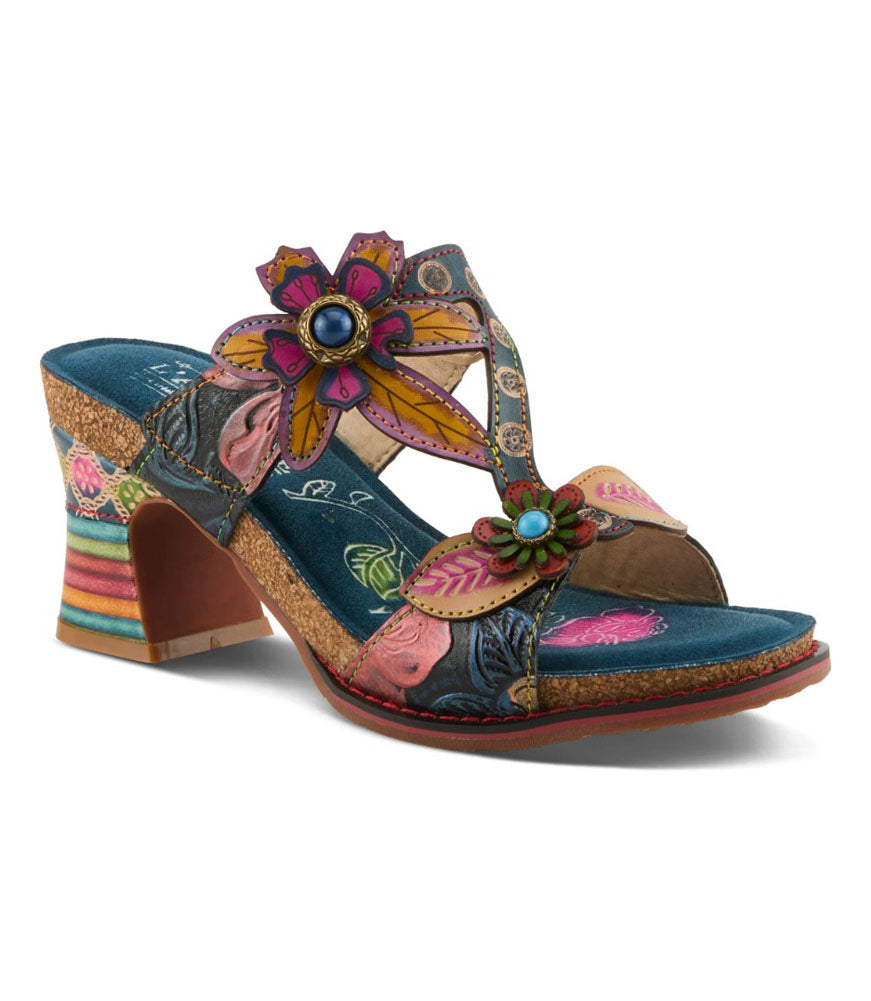 Fashion and leisure. This leather sandal wedge was made for both. The embossed floral pattern, lattice work at the top with an antiqued flower, gives it a rich combination of details.