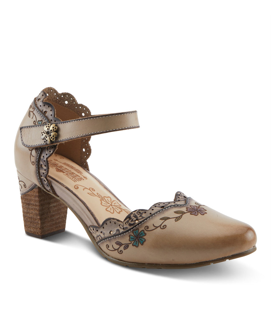 Delicately refined, this taupe leather pump features scalloped edges, embroidered floral accents, and an antique-inspired buckle strap, all set on a block heel that blends vintage grace with modern comfort.