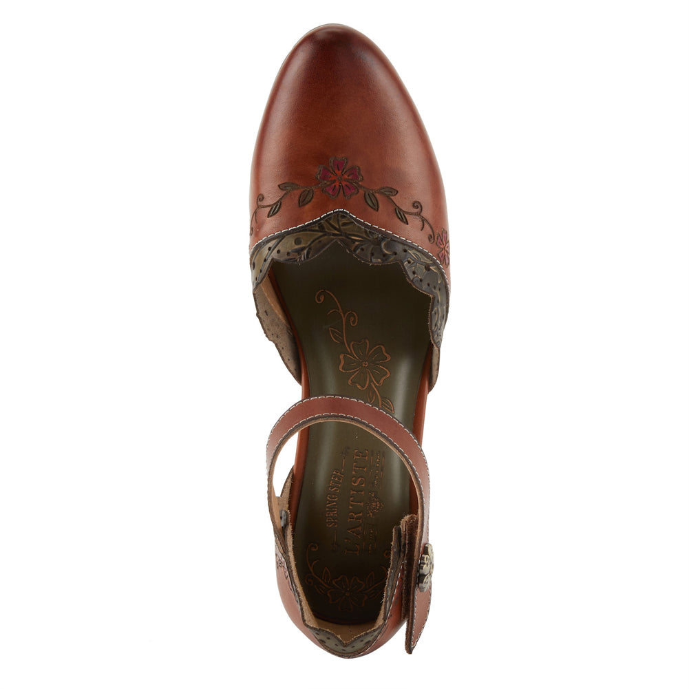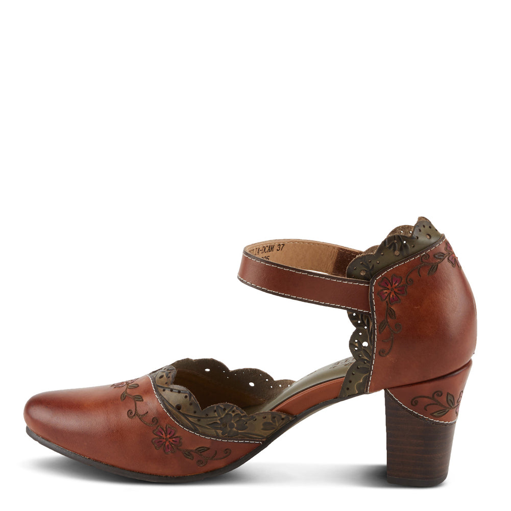 Delicately refined, this dark brown leather pump features scalloped edges, embroidered floral accents, and an antique-inspired buckle strap, all set on a block heel that blends vintage grace with modern comfort.
