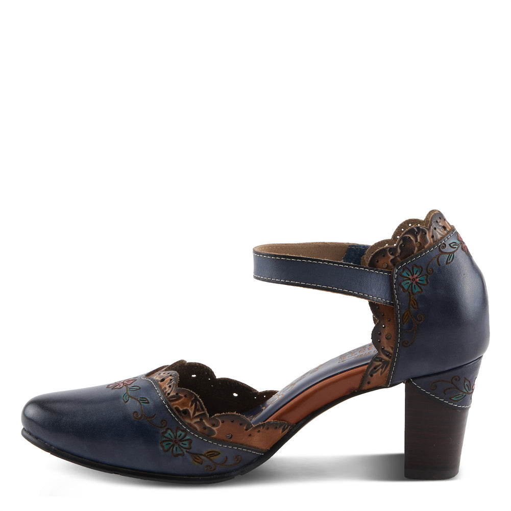 Delicately refined, this navy leather pump features scalloped edges, embroidered floral accents, and an antique-inspired buckle strap, all set on a block heel that blends vintage grace with modern comfort.