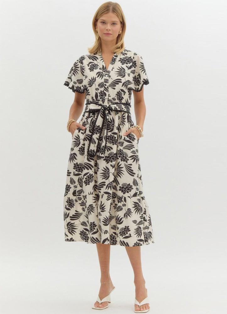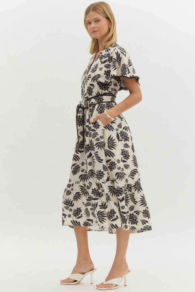 Effortlessly chic and perfect for summer, this black and white floral midi dress features a flattering cinched waist with a tie belt, breezy short sleeves, and a relaxed silhouette that transitions seamlessly from day to night.