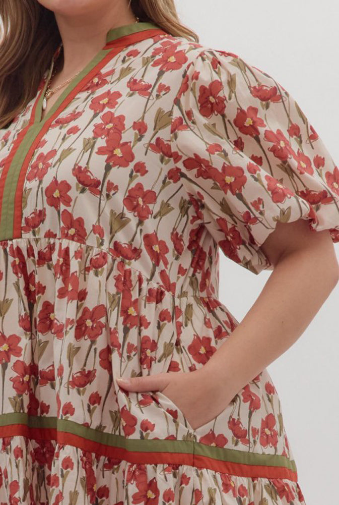 Plus Floral Print Tiered Midi Dress in Rust by Entro