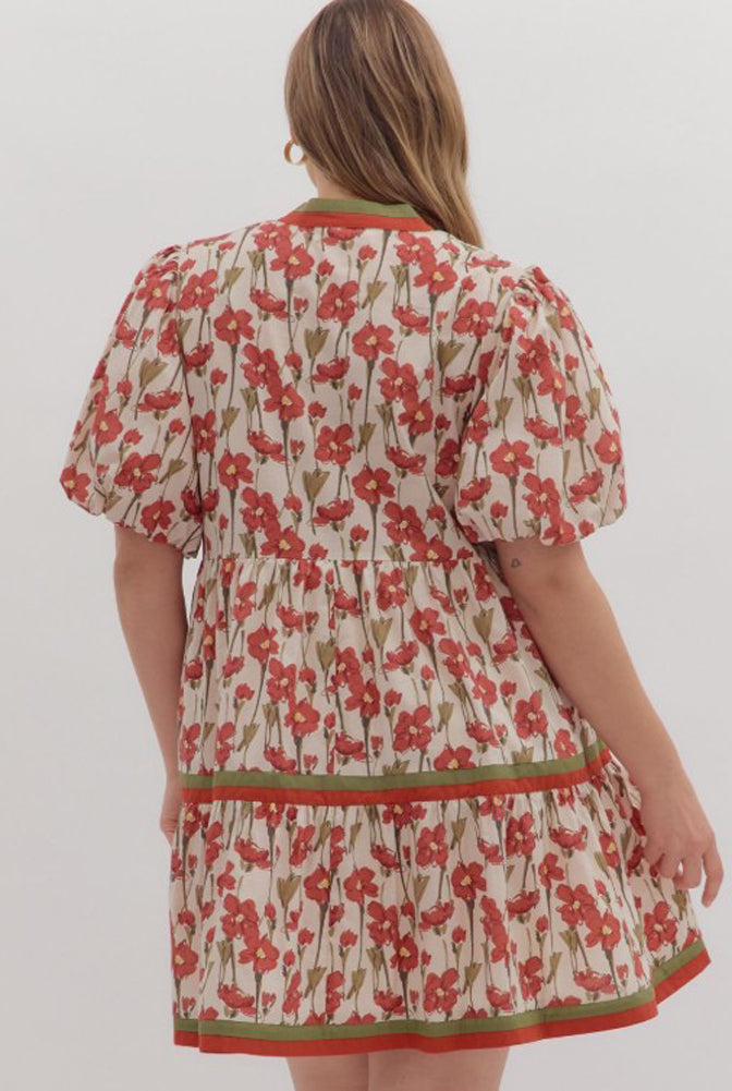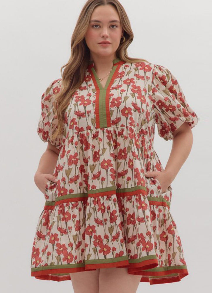 Effortlessly chic and comfortable, this floral mini dress features a tiered silhouette, puff sleeves, and playful pockets. Perfect for sunny days and casual outings.