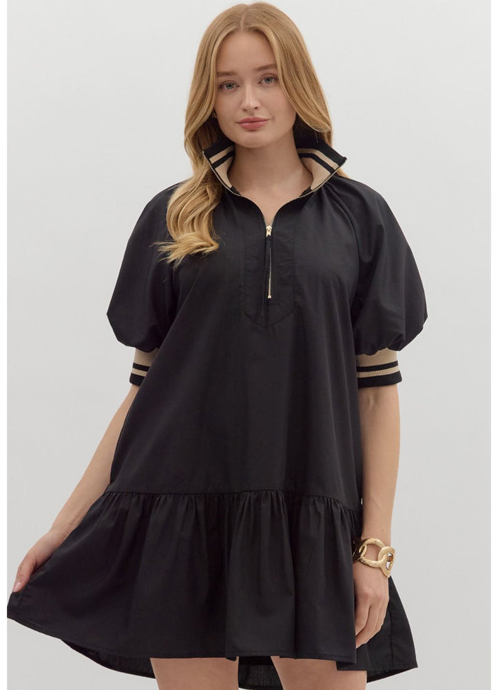 Sporty meets chic in this effortlessly cool mini dress, featuring a zip-up collared neckline, striped ribbed cuffs, and puff sleeves for a modern twist. The relaxed fit and ruffled hem add playful movement. Perfect for weekend wear, travel days, or casual nights out.