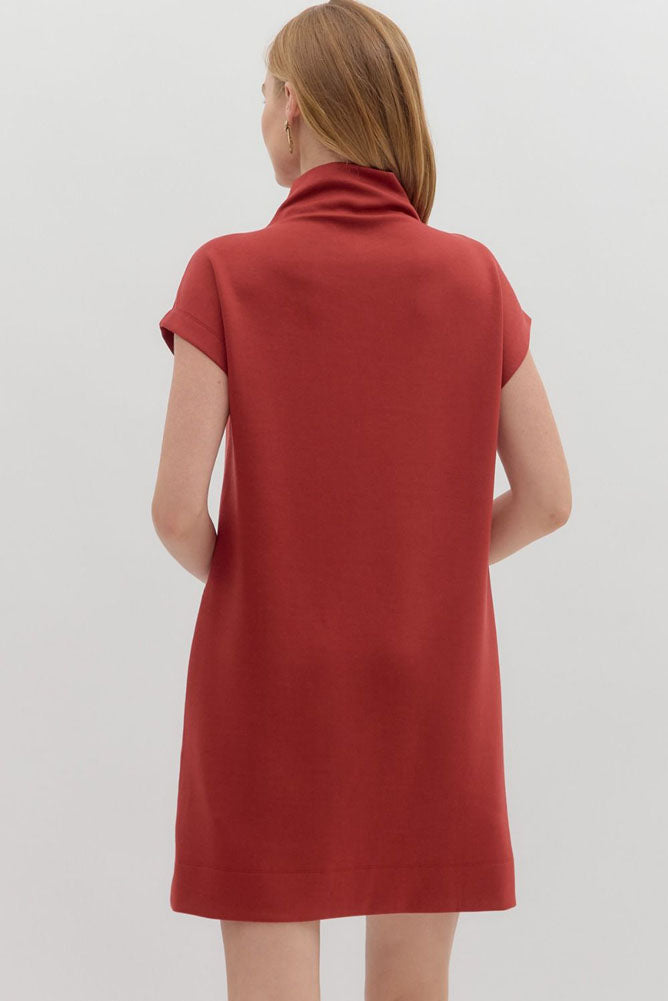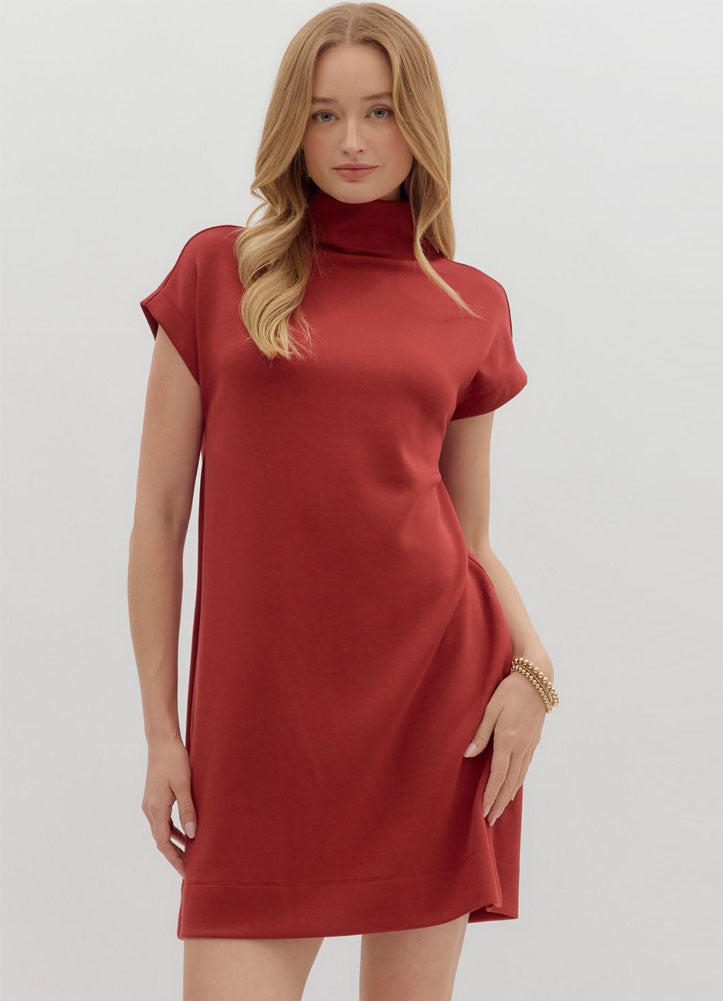 Effortlessly modern, this brick red mock-neck dress features a relaxed shift silhouette, short sleeves, and smooth fabric that drapes beautifully for both casual and elevated looks.
