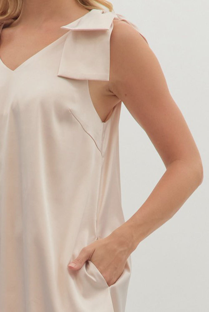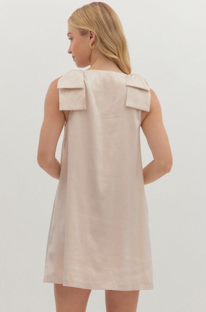 Solid Sleeveless Bow Detail Satin Mini Dress in Champagne by Entro