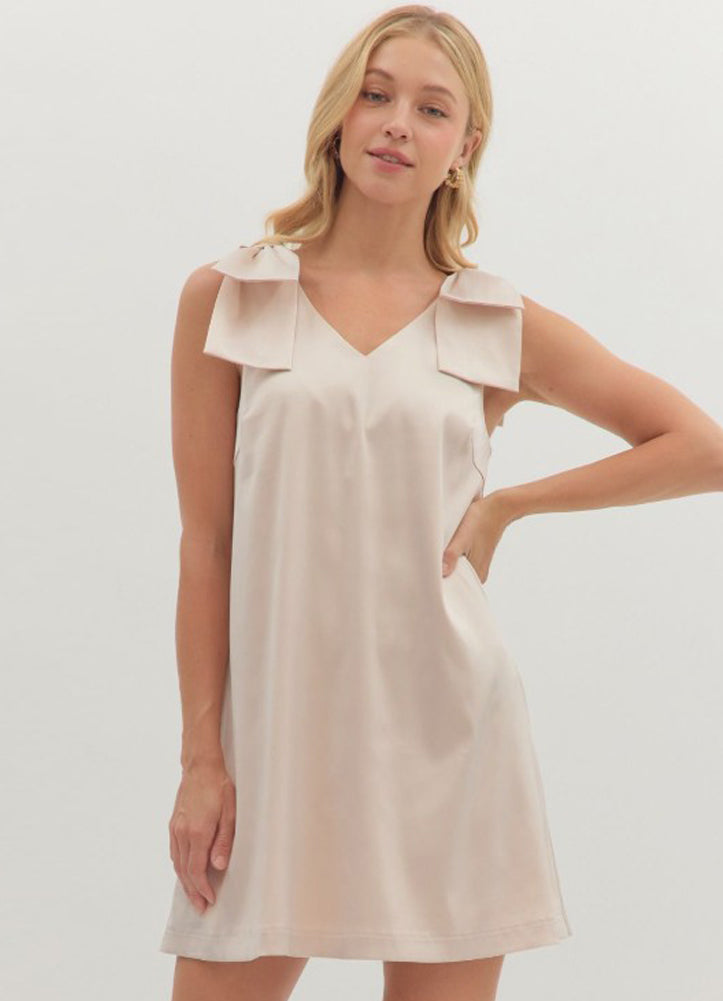 Feminine and refined, this champagne shift dress features charming bow-tie shoulders and a sleek silhouette for an effortlessly elegant look.