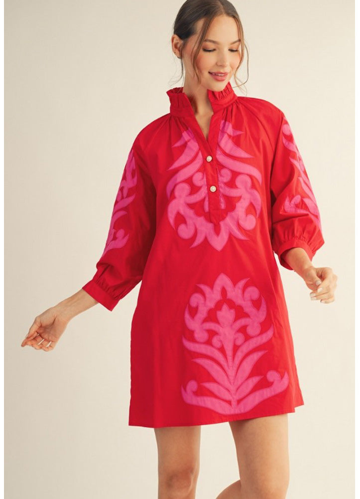 Bold, vibrant, and full of personality, this striking red shift dress is designed to turn heads. Featuring an eye-catching pink ornamental print across the front and hem, it blends playful charm with confident style. The relaxed silhouette offers easy, all-day comfort, while the above-the-knee length keeps the look fresh and flattering. A softly gathered stand collar and partial button placket add a touch of structure and feminine detail. Three-quarter length sleeves with gentle volume and elastic cuffs create a balanced, polished finish. Crafted from lightweight fabric that moves beautifully, this dress is perfect for everything from brunch dates to weekend outings or vacation getaways. Pair it with sandals for a casual daytime look or dress it up with wedges and statement earrings for an evening event. Effortlessly chic and undeniably bold, this dress brings color, comfort, and standout style to your seasonal wardrobe.