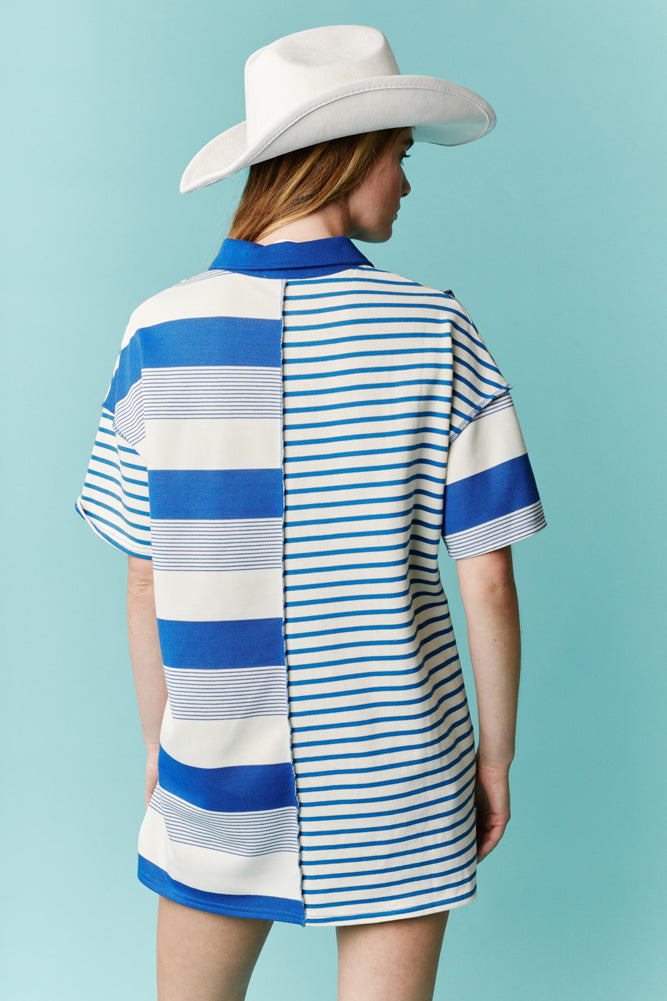 Elevate your casual wardrobe with this eye-catching striped polo dress, featuring a unique patchwork design in varying shades of blue. Crafted from soft, breathable fabric with a relaxed silhouette and button-front collar, it's the perfect blend of comfort and standout style. Wear it solo or layer it up for an effortlessly chic look.