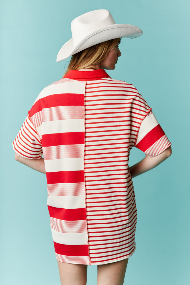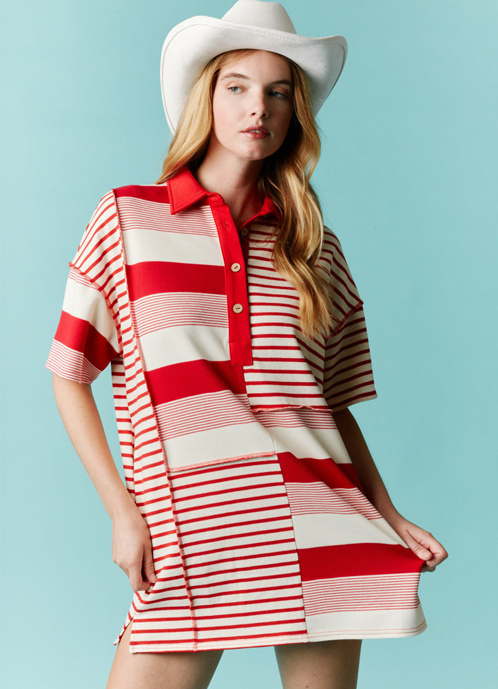Elevate your casual wardrobe with this eye-catching striped polo dress, featuring a unique patchwork design in varying shades of red. Crafted from soft, breathable fabric with a relaxed silhouette and button-front collar, it's the perfect blend of comfort and standout style. Wear it solo or layer it up for an effortlessly chic look.