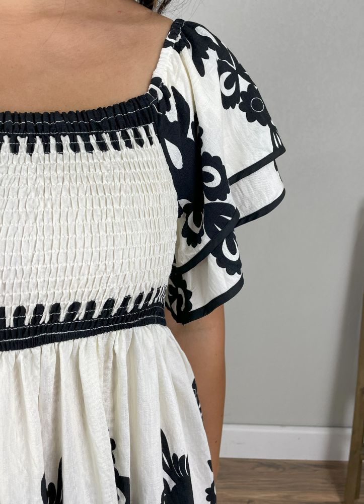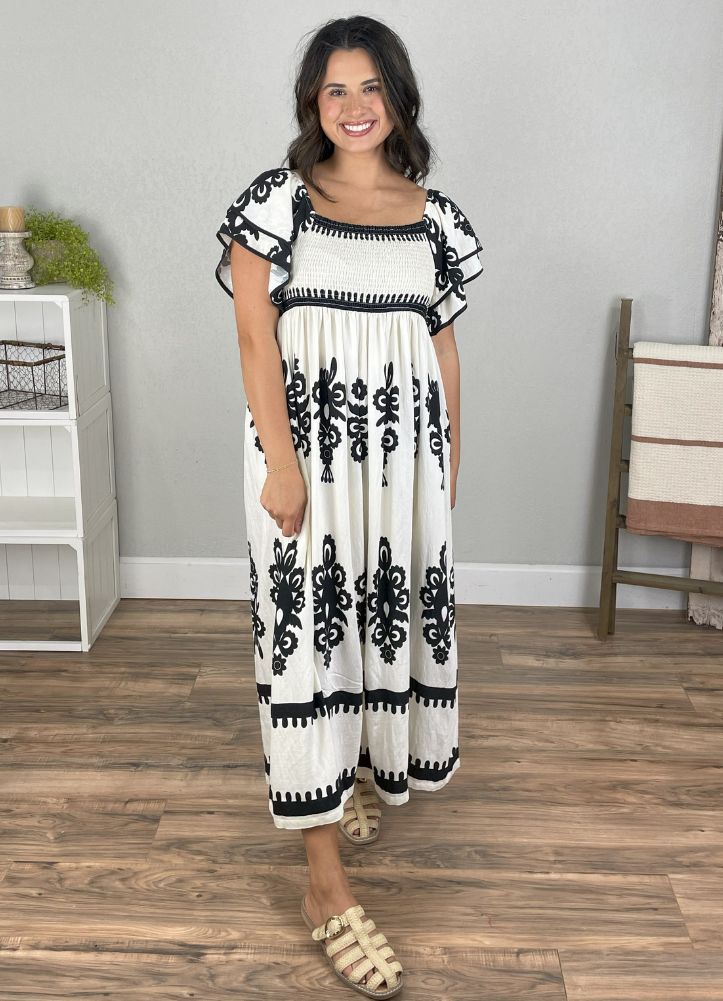 Make a bold statement in this black and white embroidered maxi dress! Featuring flutter sleeves and a smocked bodice for comfort and effortless charm.