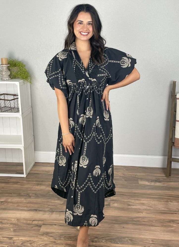 Make a statement in this boho-chic black midi dress, featuring a bold chain and tassel print, flutter sleeves, and a flattering gathered waist—perfect for everything from brunch dates to weekend getaways.