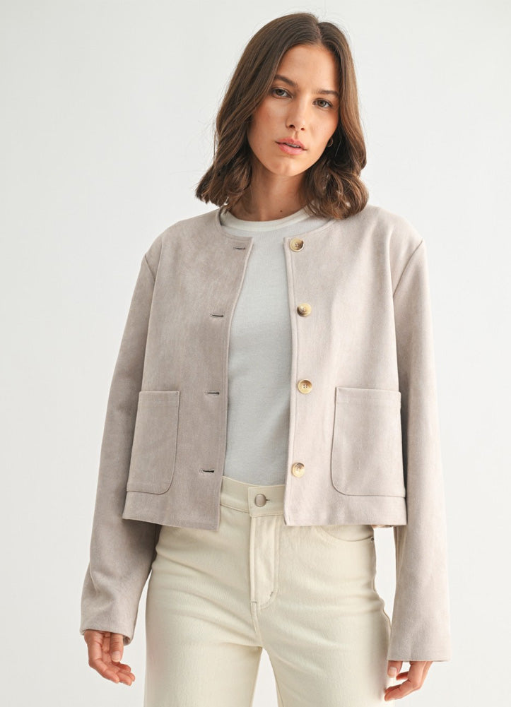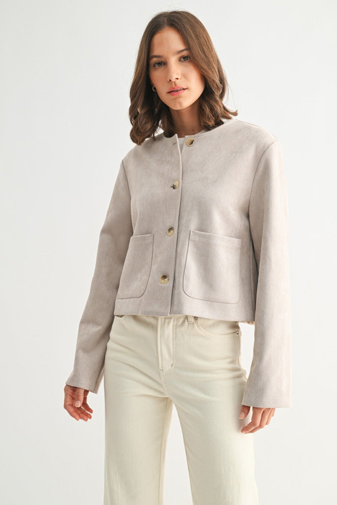 Elevate your everyday look with the Sand Suede Button-Front Jacket, a timeless layering piece that blends minimalism with sophistication. Crafted from soft faux suede, this jacket features a modern, collarless neckline, gold-tone button closures, and front patch pockets that add both style and function. The cropped silhouette flatters your figure while offering effortless versatility for any outfit.