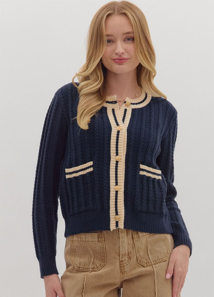 This navy knit cardigan features cream trim details, gold button closures, and front pockets, blending timeless sophistication with cozy comfort for versatile layering.