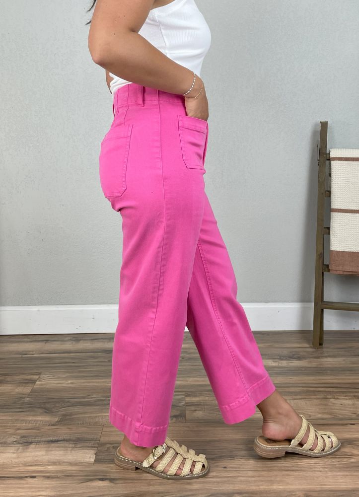 Bring the bold in these high-rise wide-leg pants, featuring vibrant pink denim, front and back patch pockets, and a cropped length for a fun, flattering fit that pops with every step.