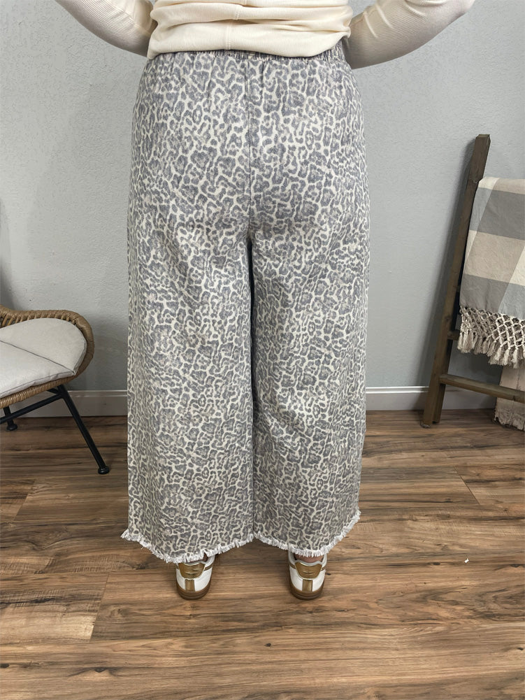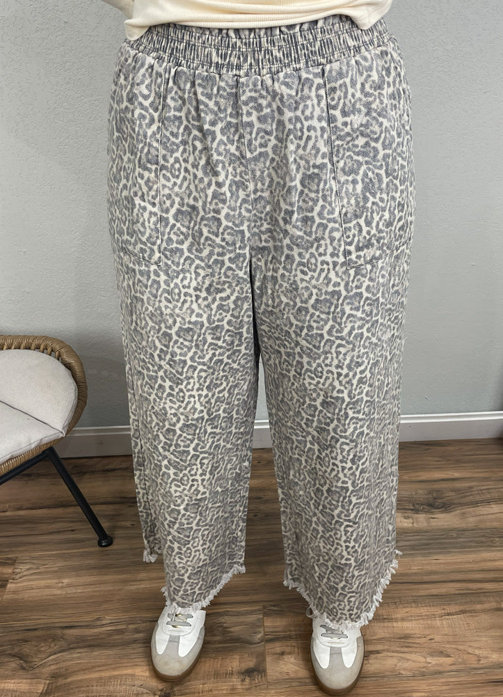 Comfort meets statement style in these relaxed leopard print pants, featuring a soft washed fabric, elastic waistband for an easy pull-on fit, roomy front pockets, and a raw-edge hem for a touch of casual edge. Perfect for everyday wear while still standing out with effortless personality.