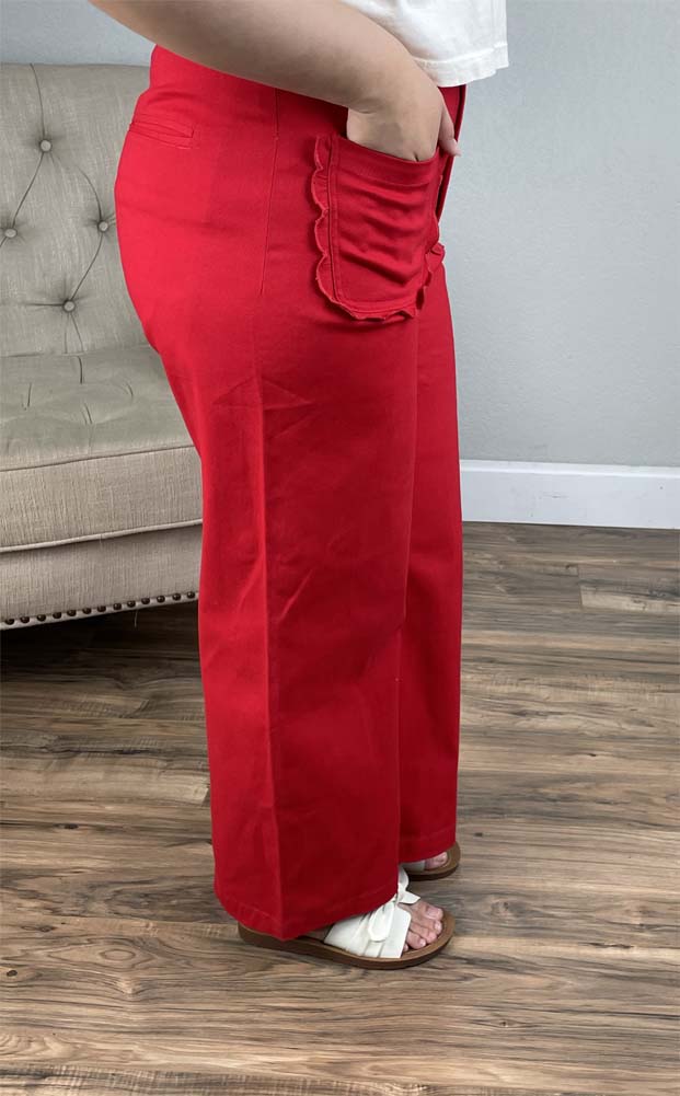 HW Wide Leg Pants with Scallop Edge Pockets in Red by Jodifl