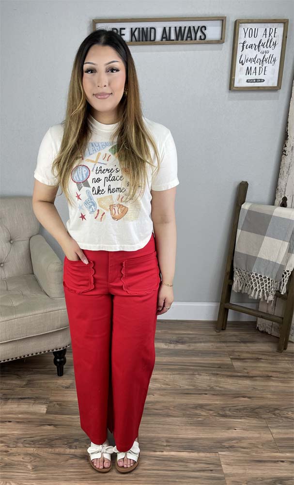 Bold meets nostalgic in this fun, statement-making look. The vintage-inspired graphic tee brings a playful touch with its “There's no place like home” design, blending soft colors and retro charm for a laid-back, feel-good vibe. Paired with vibrant red wide-leg pants, this outfit instantly turns heads while still feeling effortless and wearable.