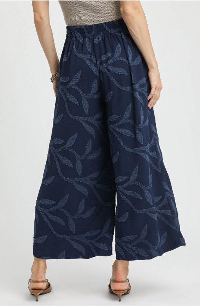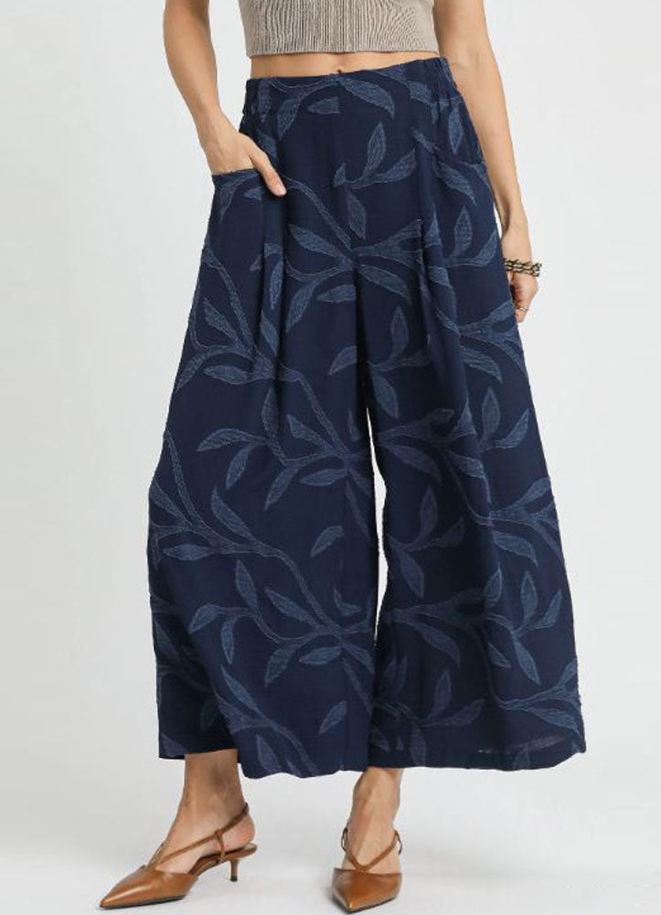 Refresh your wardrobe with these elegant navy wide leg pants, designed for both comfort and sophistication. Crafted from a lightweight, flowy fabric, they feature a tonal leaf pattern that adds subtle texture and visual interest. The high rise fit and soft pleating create a flattering silhouette, while the relaxed wide leg design ensures effortless movement and comfort. Side pockets add a practical touch, making these pants as functional as they are stylish. Perfect for pairing with a fitted top or blouse, these versatile pants transition seamlessly from casual daytime wear to chic evening outings. A timeless piece for effortless elegance.