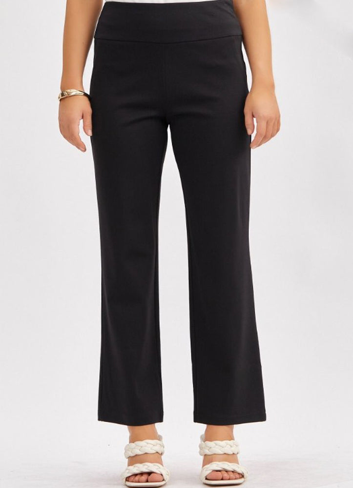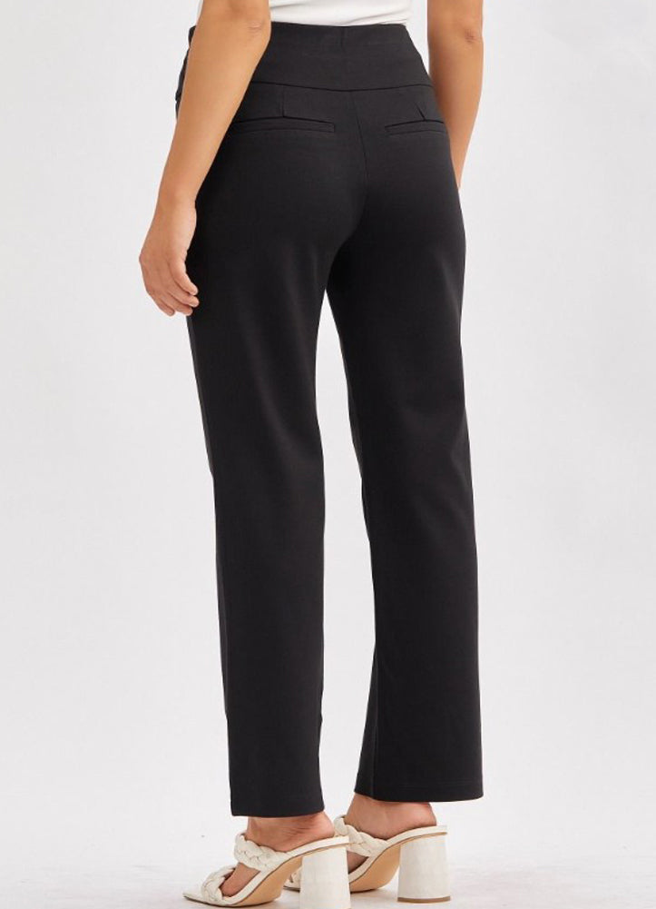 Streamline your look with these sleek pull-on black straight-leg pants, designed for a polished fit with ultimate comfort. Featuring a clean, wide waistband and faux back pockets, these pants offer a flattering silhouette and day-to-night versatility. Perfect for office wear or a dressy casual look.