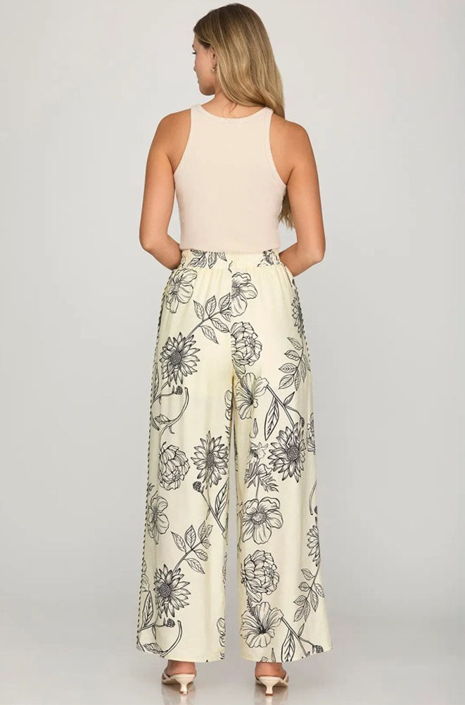 Elevate your everyday style with these elegant wide-leg pants, featuring a soft neutral base adorned with delicate floral linework and a striking contrast side stripe. Designed with a comfortable elastic waistband and a relaxed, flowing silhouette, they move beautifully with every step and pair effortlessly with tanks, blouses, or sandals for a chic look that transitions seamlessly from daytime outings to evening plans.