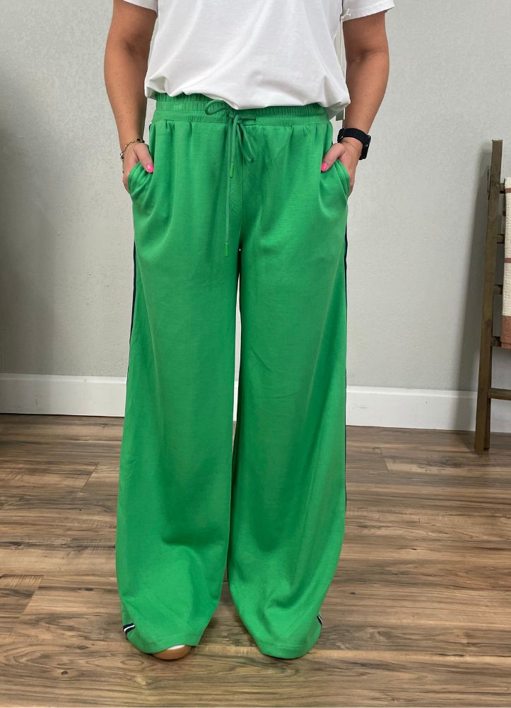 Stay cool and comfy in these bold green lounge pants with classic navy-and-white side stripes. The wide-leg cut, soft stretch fabric, and adjustable drawstring waist make them perfect for laid-back days, travel, or a sporty off-duty look.