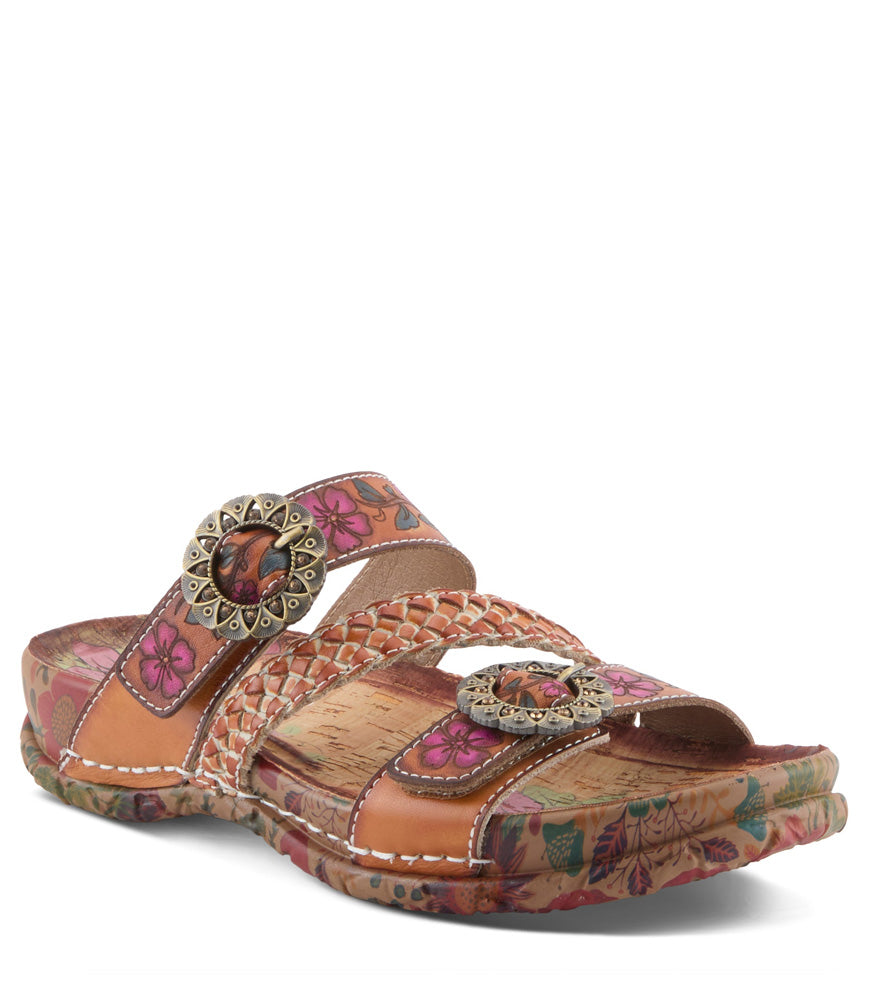 A vibrant artisan-inspired slide sandal featuring floral-printed straps accented with decorative antique-style buckles and a braided blue leather strap for added texture. The cushioned footbed showcases a whimsical botanical print over a cork-inspired base, while contrast stitching and a lightweight sole provide lasting comfort. This colorful design blends handcrafted charm with everyday wearability, making it a stylish choice for relaxed summer outings and casual warm-weather looks.