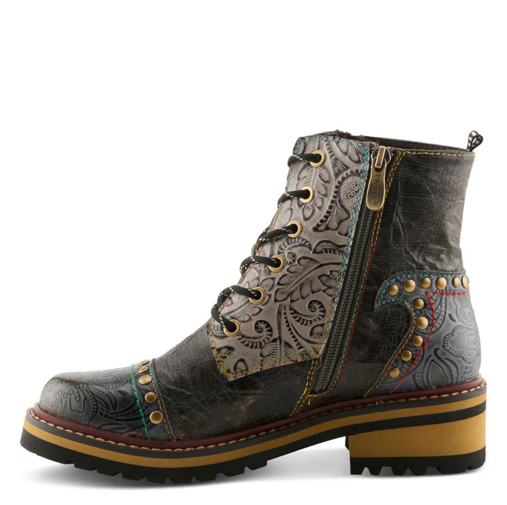 Bold leather ankle boot with embossed detailing, metal studs, colorful stitching, and side zipper—offering edgy style and lasting comfort in every step.