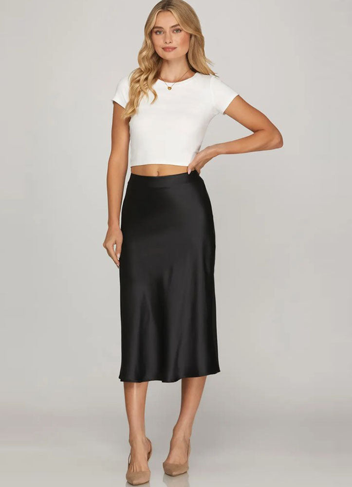 Elevate your wardrobe with this sleek and versatile midi skirt, designed in a smooth black finish that brings effortless sophistication to any outfit. Featuring a flattering high-waist fit and a fluid, silky drape, it moves beautifully while creating a clean, streamlined silhouette. Perfect for dressing up with heels and a blouse or keeping it casual with flats and a tee, this timeless skirt transitions seamlessly from day to night.