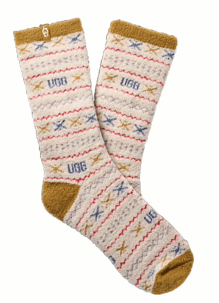 Infuse your cold-weather wardrobe with warmth and whimsy. These ultra-soft crew socks from UGG feature a festive jacquard pattern in oatmeal, gold, blue, and red — the perfect touch of cozy charm for lounging or layering.