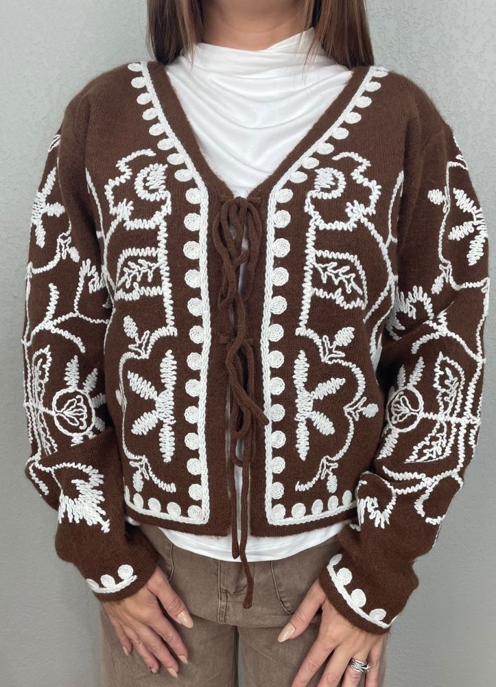Add a bohemian touch to your look with this brown knit cardigan featuring intricate white embroidered floral patterns. The tie-front closure and cropped fit create a relaxed, laid-back style, while the soft knit fabric ensures cozy comfort. Perfect for layering over tees or blouses, this statement cardigan pairs beautifully with denim or neutral trousers for a chic everyday outfit.