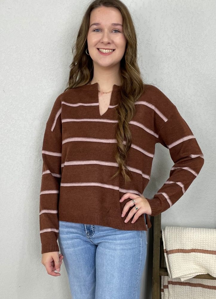 Effortlessly casual, this brown striped sweater features a split neckline, soft knit fabric, and a relaxed silhouette. Easy to pair with denim or trousers for an everyday laid back look.