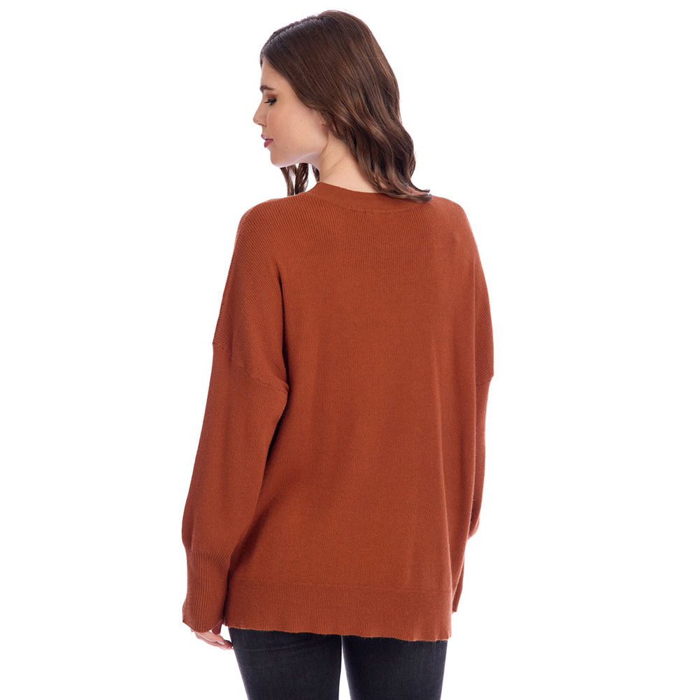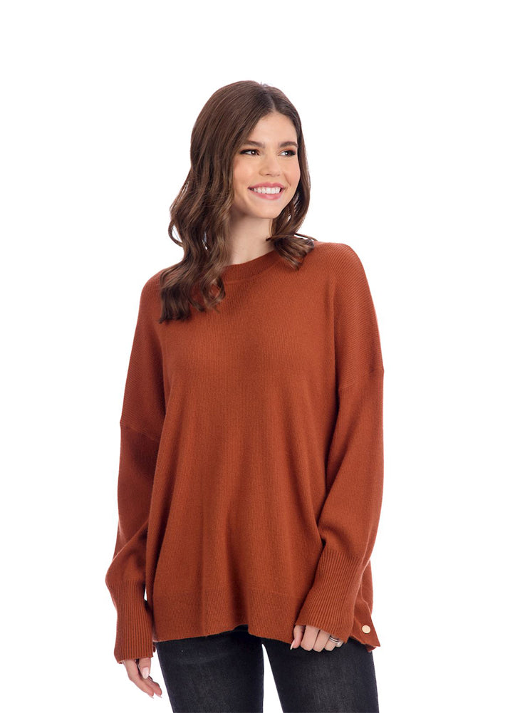 Embrace effortless style and comfort with this rust-colored knit sweater, featuring chic side button accents and a relaxed, cozy fit perfect for layering in any season.