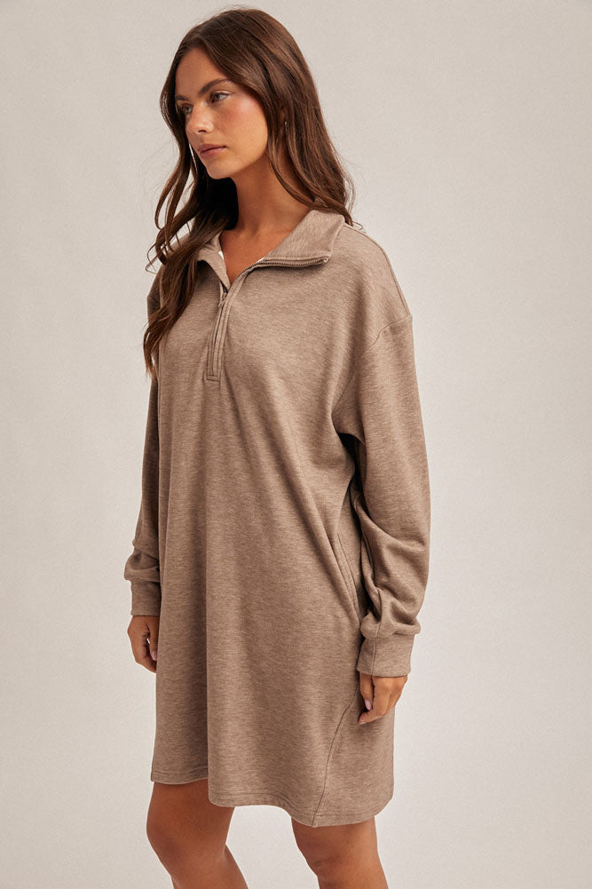 Redefine cozy chic with this half-zip sweatshirt dress, designed for women who love comfort without sacrificing style. Crafted in a soft taupe knit, this relaxed-fit dress offers the perfect blend of lounge-worthy ease and street-ready fashion. The half-zip neckline adds a sporty touch, while the drop shoulders and long sleeves create a laid-back, oversized look.