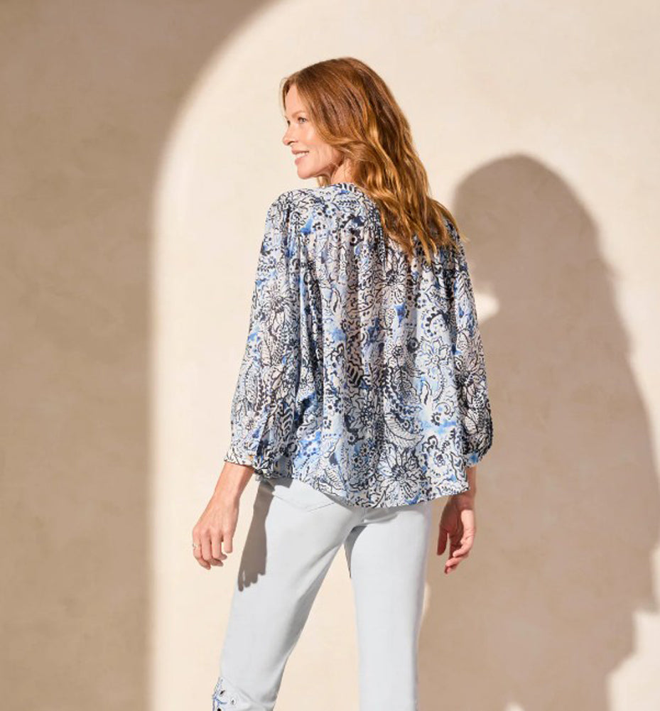 Breeze through your day in this relaxed button-front blouse, featuring a soft blue and navy floral print with flowy sleeves—perfect for effortless elegance.