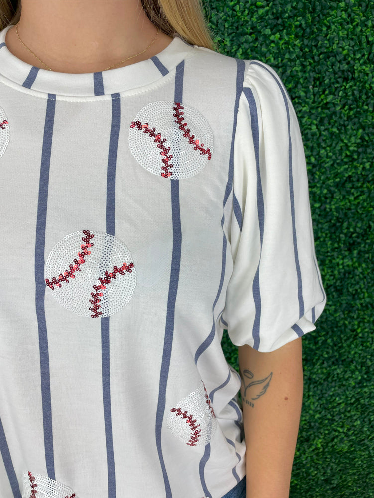 Show your team spirit in style with this fun puff sleeve top featuring vertical stripes and baseball stitch accents. A perfect choice for game day or casual outings. Pair with your favorite jeans or shorts for a day at the ballpark or cheering on your team at home.