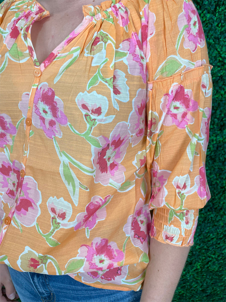 Bring on the sunshine with this vibrant apricot floral top! Featuring a split neckline with button detail, gathered 3/4 sleeves, and a breezy silhouette, it's a cheerful statement piece perfect for brightening up any day.
