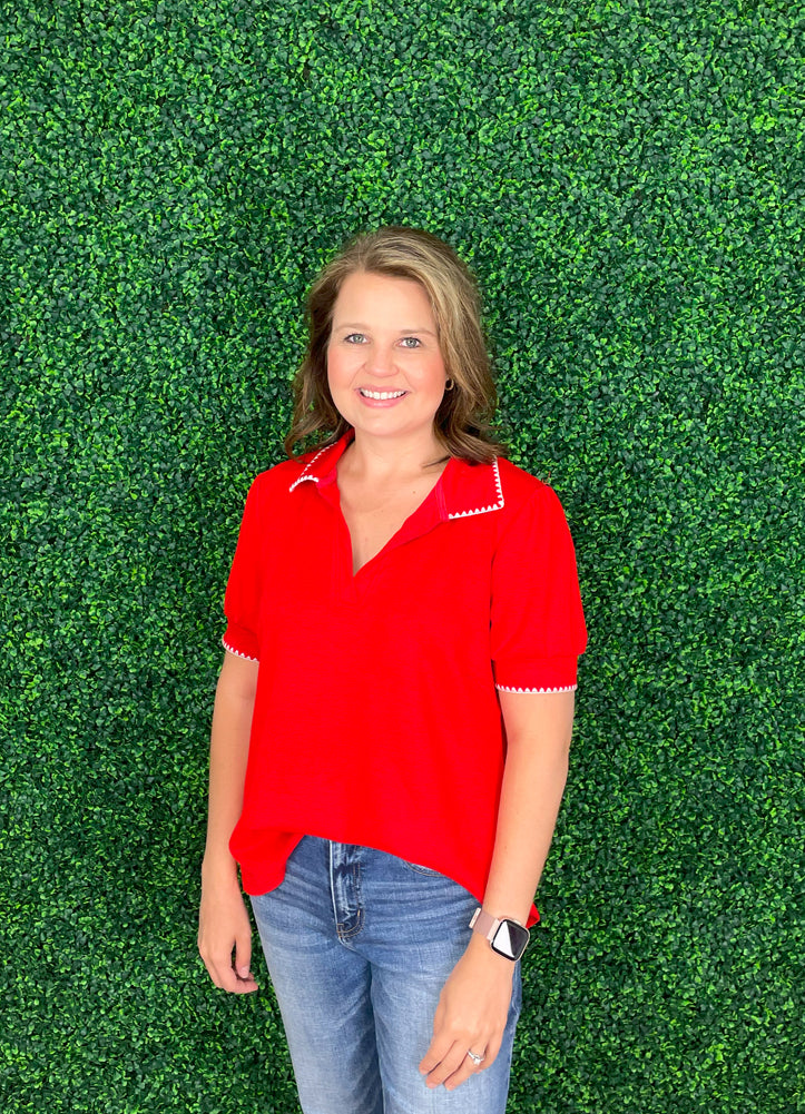 Turn heads in this bold red contrast trim polo, featuring playful ric-rac trim and a collared neckline that blends classic charm with casual comfort.