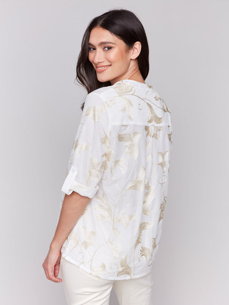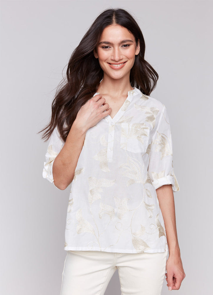 Embroidered Roll Up 3/4 Sleeve Popover Blouse in Gold by Charlie B