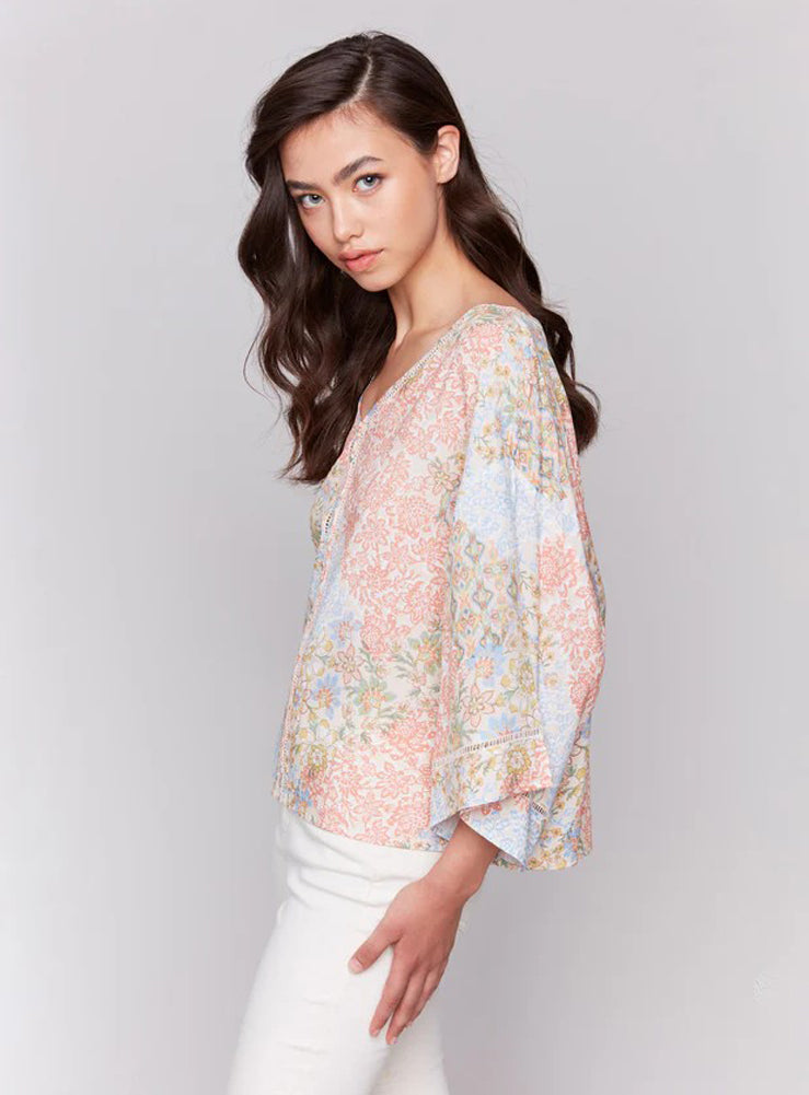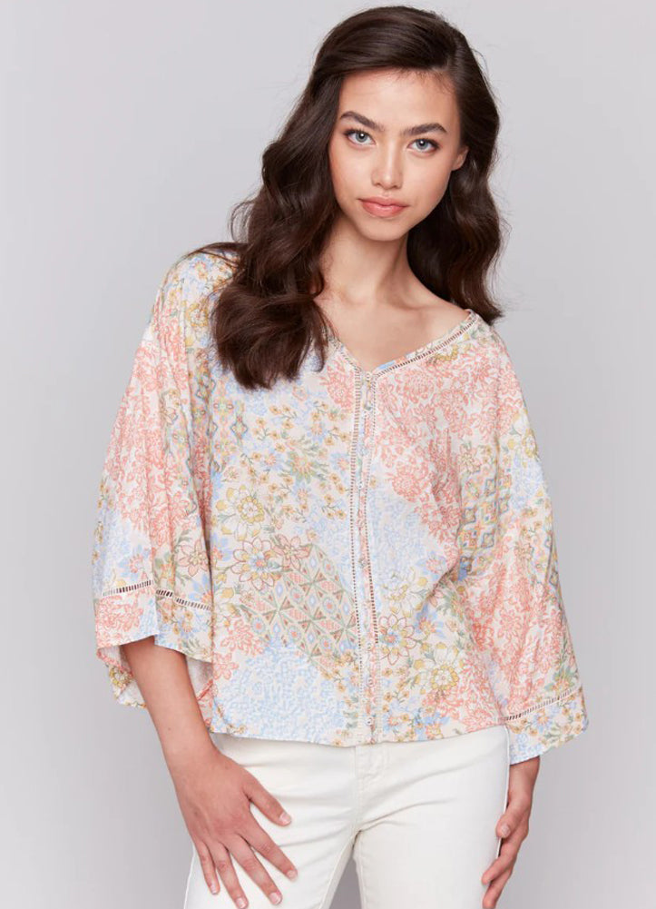 Printed 3/4 Wide Sleeve Blouse with Ladder Stitch in Flowers by Charlie B