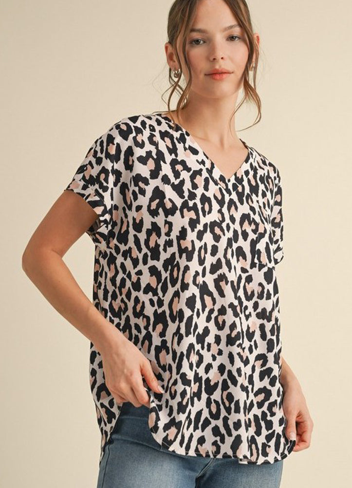 Unleash your wild side. This lightweight V-neck top features a soft blush and black leopard print, relaxed fit, and breezy silhouette — an effortlessly chic pick for work or weekend.