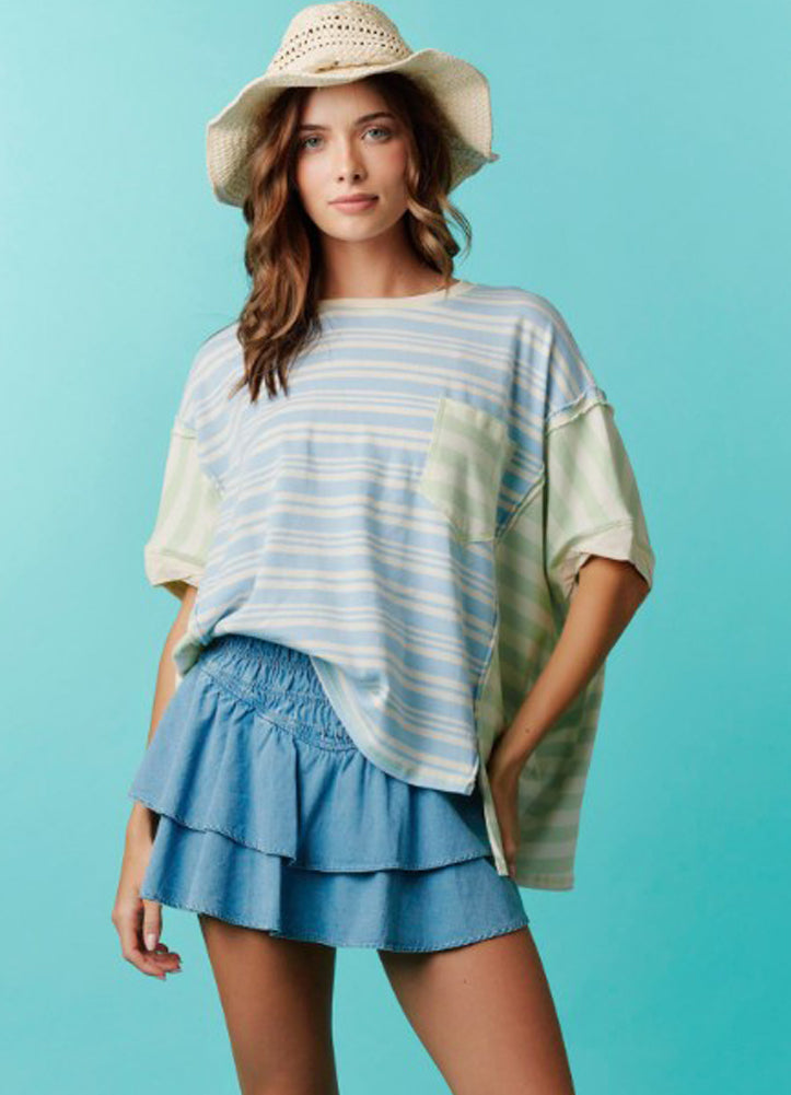 Soft, airy, and effortlessly cool — this pastel striped oversized tee is your go-to for laid-back days and sunshine escapes. Featuring mixed directional stripes, a relaxed fit, and a front pocket detail, it brings playful charm and all-day comfort. Pair it with your favorite denim or flowy skirts for that easy, breezy beach-town vibe.