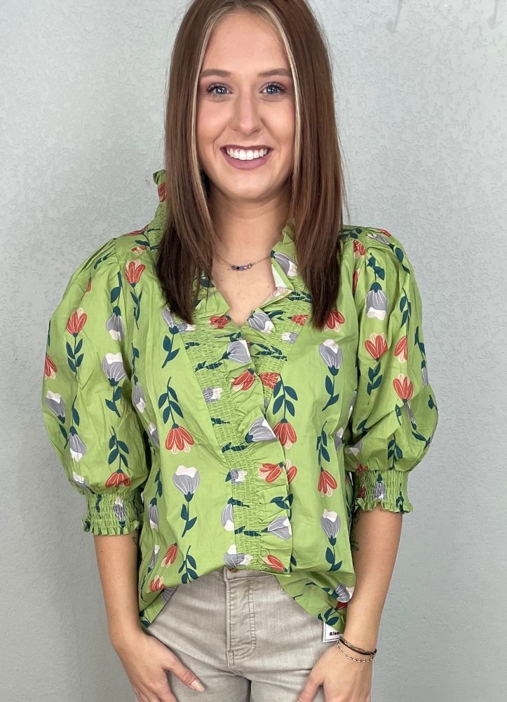 Brighten your wardrobe with this lively green blouse, featuring a playful tulip floral print in shades of red, white, and gray. Designed with puff sleeves, smocked details, and a flattering v-neckline, it blends feminine charm with modern style. Perfect for spring and summer outings, this blouse pairs beautifully with denim or neutral trousers for a fresh, cheerful look.