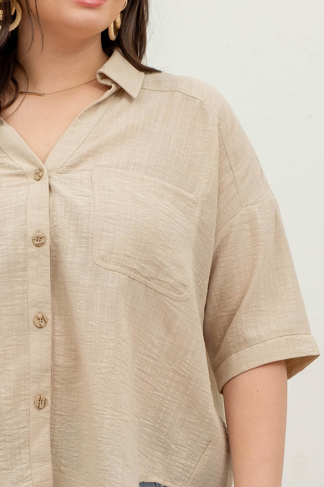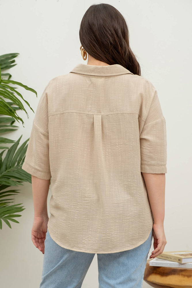 Effortlessly elegant, this breezy button-up blouse in soft khaki features a relaxed fit, cuffed sleeves, and subtle texture—perfect for versatile styling from weekday workwear to weekend ease.