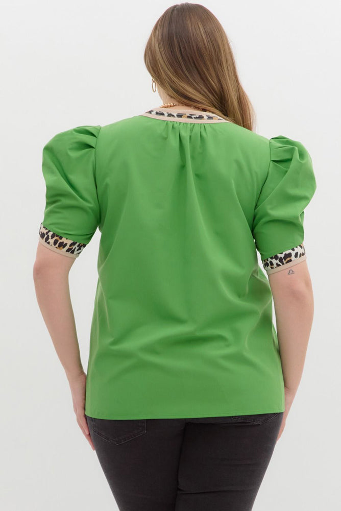 Add this simple green but elegant top to your wardrobe for everyday outings. It features detailed puffy sleeves and leopard print trim around the sleeves and neckline.