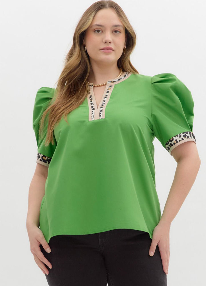 Plus Solid Pleated Voluminous Sleeve Top with Leopard Accent in Green by Entro