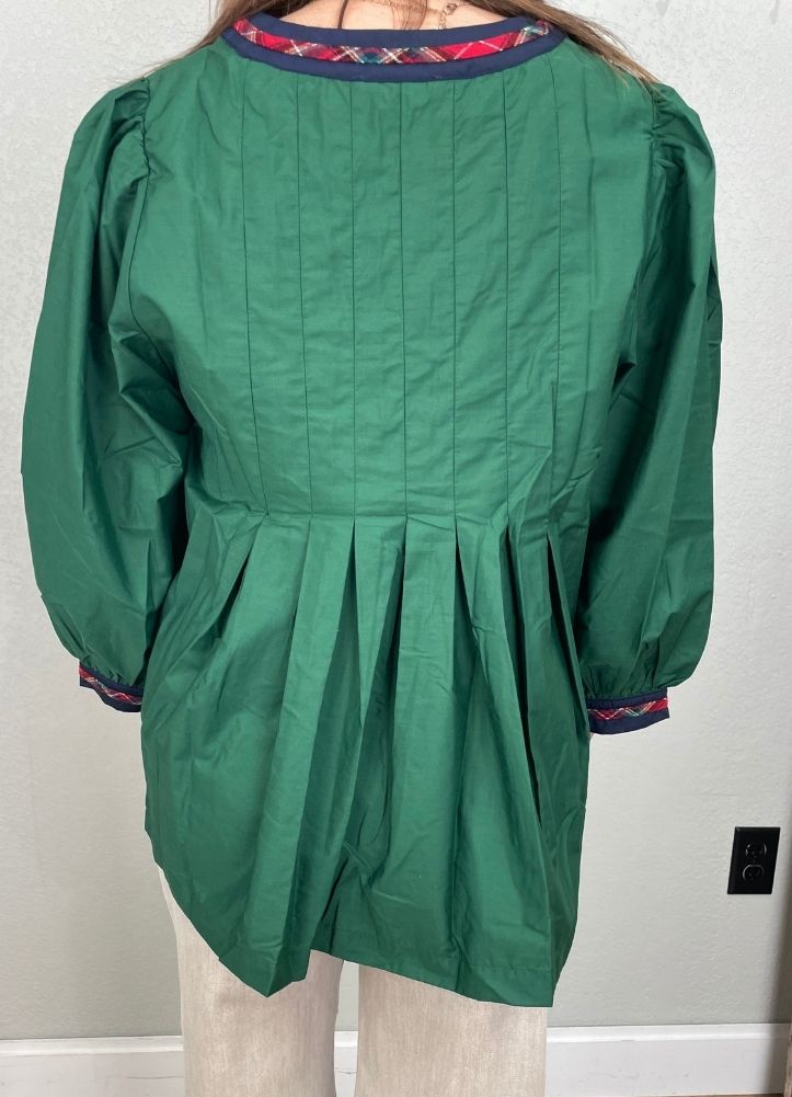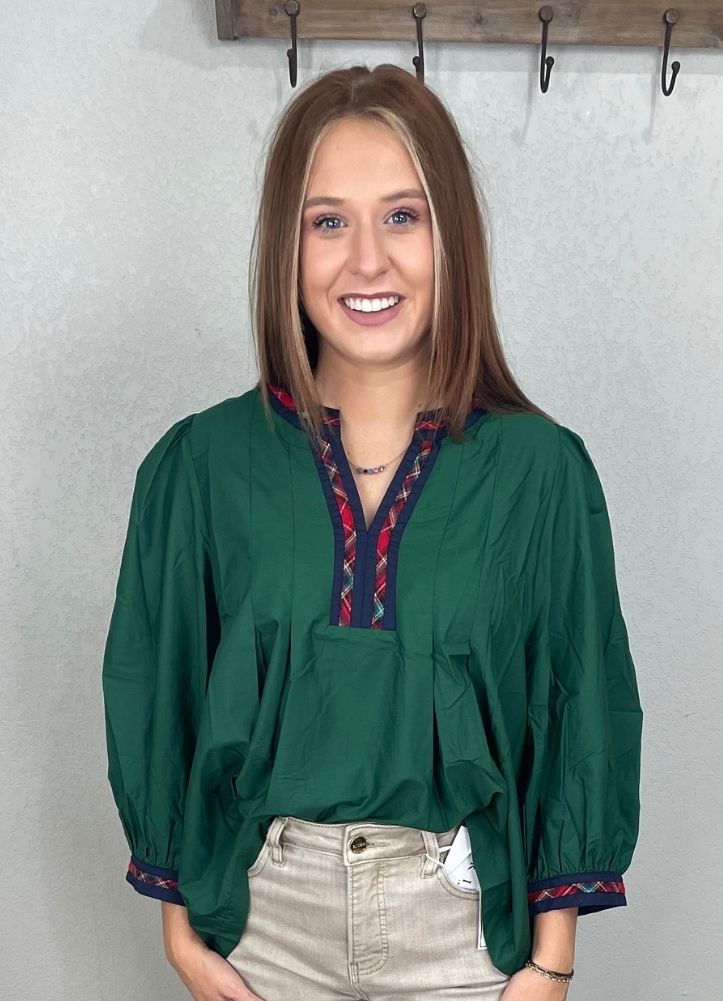 Bring festive flair to your wardrobe with this deep green blouse, featuring plaid-trim accents along the neckline and cuffs. Designed with a relaxed silhouette and 3/4 sleeves, it blends casual comfort with a touch of seasonal charm. Perfect for holiday gatherings or everyday wear, this top pairs effortlessly with denim or neutral pants for a polished yet cozy look.